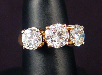 SHOW STOPPING 3 STONE DIAMOND RING: 14K yellow gold ring with three diamonds. One round brilliant cut diamond measures approx. 6.44-6.46 x 3.85 mm. WEIGHT: .98 Ct. Approx. Rated SI2 in clarity and J in color. CENTER One round brilliant cut diamond measures approx. 6.82-6.90 x 4.17 mm. WEIGHT: 1.22 Ct. Approx.Rated SI2 in clarity and J in color. One round brilliant cut diamond measures approx. 6.43-6.46 x 3.86 mm. WEIGHT: .98 Ct. Approx. Rated SI2 in clarity and J in color. TOTAL DIAMOND WEIGHT: 3.18 Ct. Approx. The diamonds are prong set. Weight: 4.1 grams. Size: 5.5 Sold with current Florida Diamond Appraisers GIA graduate's appraisal for $15,895.