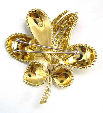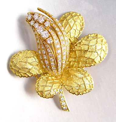18K GOLD AND DIAMOND FLOWER BROOCH: 18K yellow gold flower brooch contains ninety nine (99) round brilliant cut diamonds measuring approx. 1.50 mm (smallest) to approx. 4.00 mm (largest). TOTAL DIAMOND WEIGHT: 3.15 Ct. Approx. The diamonds average VS1-VS2 in clarity and G-H in color. The diamonds are prong and bead set. Double bar pin closure. Weight: 32.0 grams. Approx. 2.5'' in length. Sold with current Florida Diamond Appraisers GIA graduates appraisal for $8,500. Est. $5000/7000**