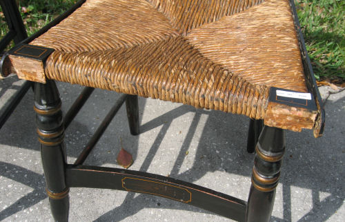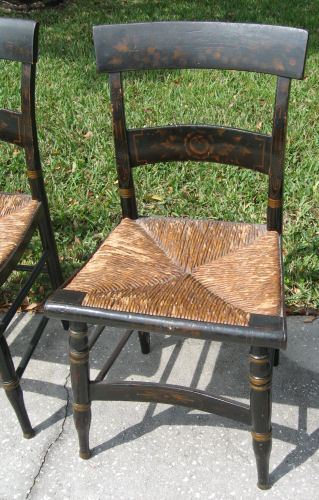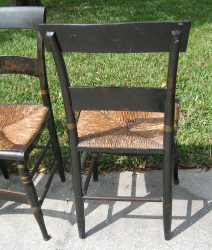 19TH C SET OF 6 SHERATON STYLE PAINTED SIDE CHAIRS: Fruit design on back rails. Original worn painted finish. Measures 34'' high x 16 1/2'' wide x 17 1/2'' deep.