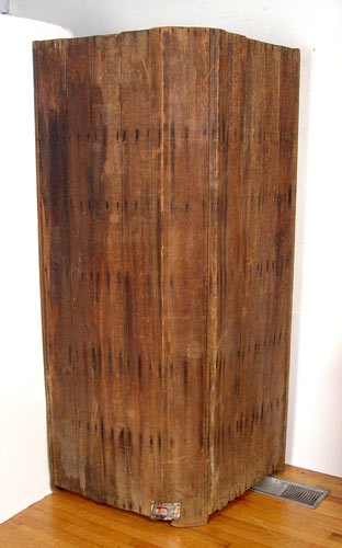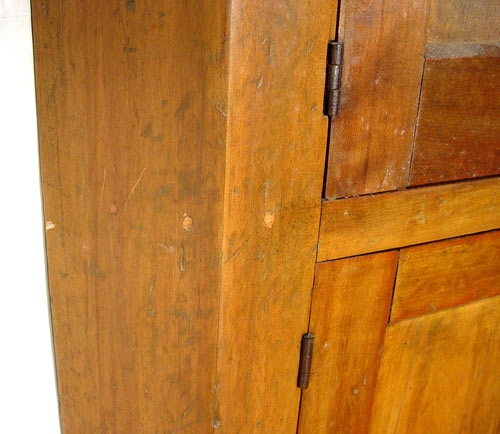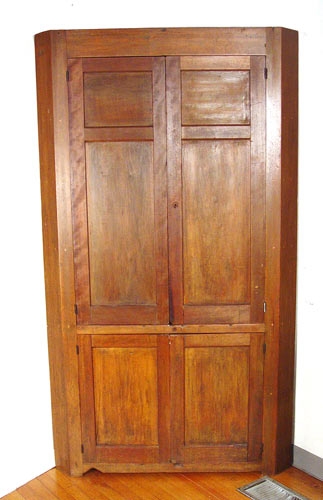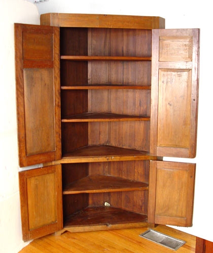 EARLY AMERICAN COUNTRY CORNER CABINET: Four door, shelved interior, original back. Measures 76'' high x 18 1/4'' deep x 24'' sides