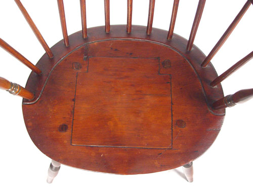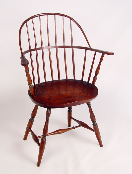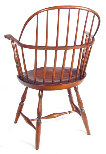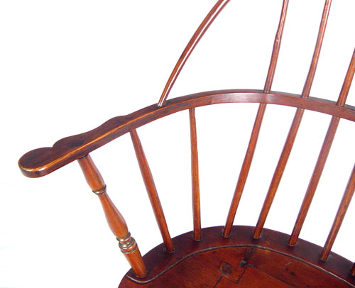 EARLY 19TH CENTURY BOW BACK WINDSOR CHAIR: Bow back divided horizontally by center rail that also forms arms. 7 full length spindles continue from top to seat. Measures 37 1/2'' high x 26'' wide x 19'' deep.