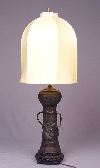 JAPANESE BRONZE LAMP: Bird motif. The lamp is hollow, Measures 14 1/2'' high body, 27 1/2'' high overall. 5'' base dia., 10'' shade dia.