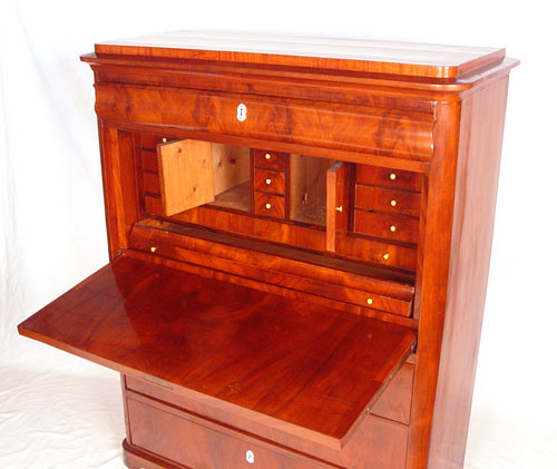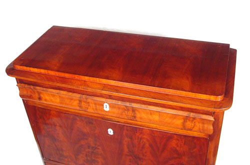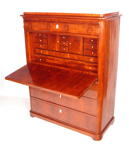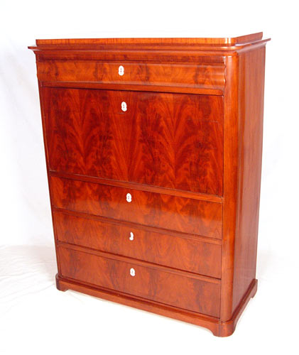 19TH CENTURY SECRETAIRE ABATTANT: Crotch grain mahogany veneers. Four full length drawers, fall front exposes an interior rich in drawers and storage. Ivory escutcheons (one has only half). Measures 53'' high x 41'' wide x 18'' deep