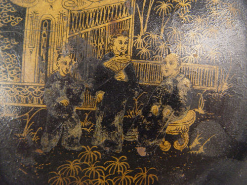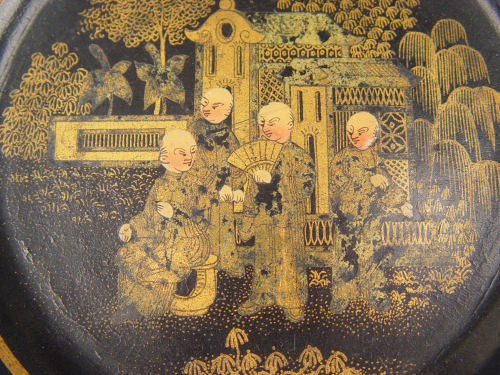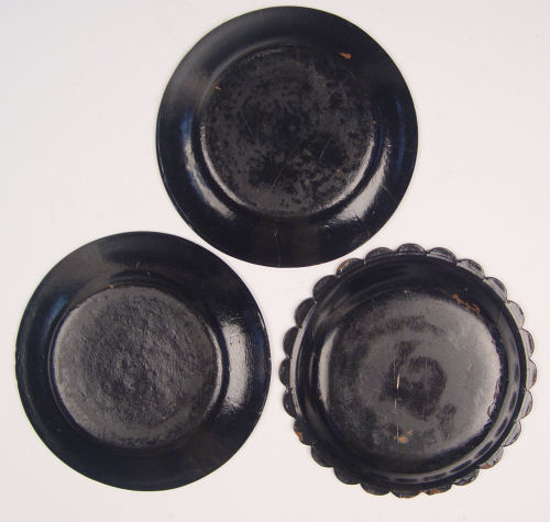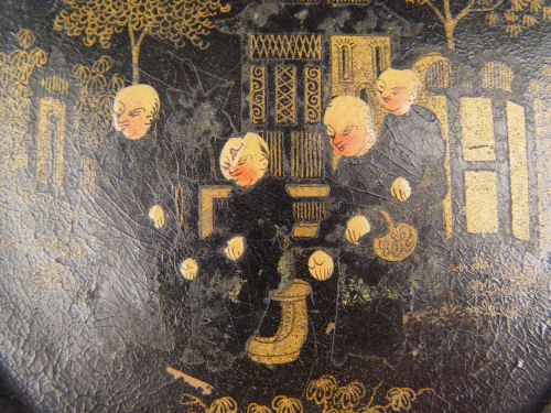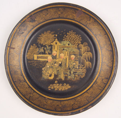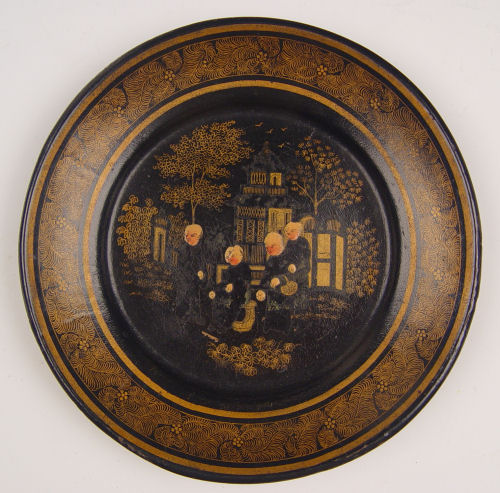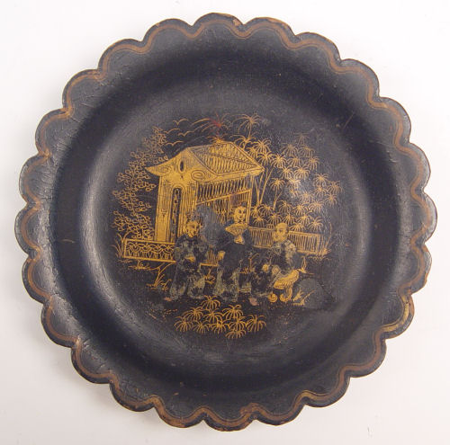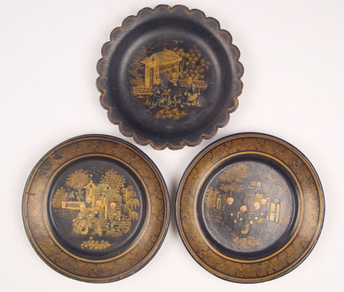 3 JAPANESE LACQUER PLATES: Hand painted, two have matching border and complimentary scenes of figures in a garden. The third plate has scalloped rim, figures in garden. Approx. 6'' dia. Note minor loss of lacquer.