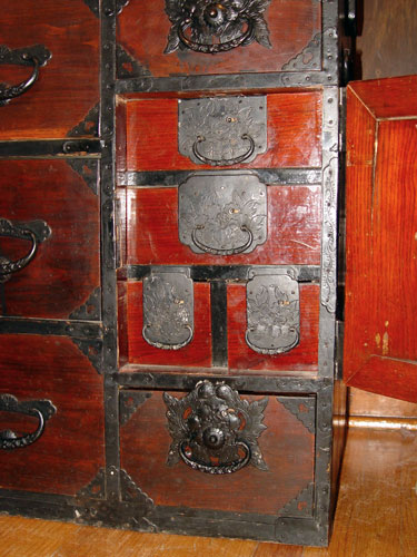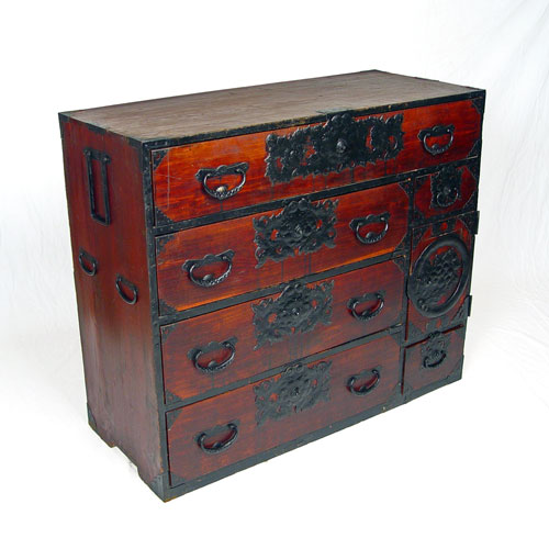 ORIENTAL CHEST: One full drawer over three 3/4 length drawers, 2 small drawers and compartment with 4 drawers. Large decorative metal hardware. 34 1/2'' high x 40 1/2'' wide x 17'' deep.