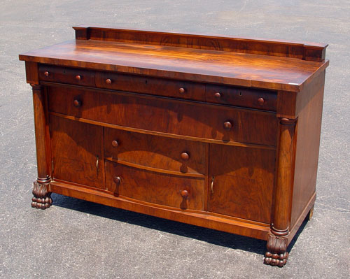 AMERICAN EMPIRE PERIOD MAHOGANY SIDEBOARD: Six drawer, 2 door side cabinet, substantial paw feet under columnar stiles. Worn condition. Measures 41 3/4'' high x 66'' wide x 26'' deep