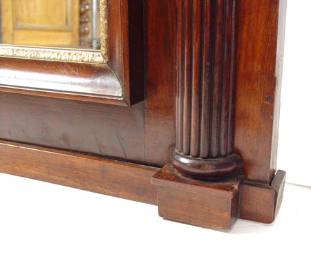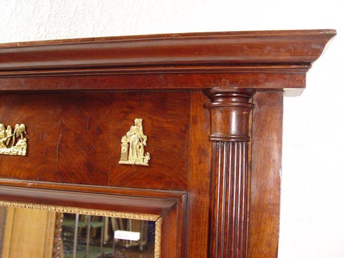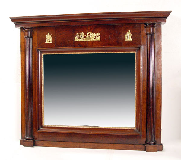 EARLY 19TH C FRENCH MAHOGANY MIRROR: Straight overhanging cornice, reeded columns and angelic figural ormolu mounts. 42 1/2'' high x 51 1/2'' wide x 4 3/4'' deep. Looking glass is 22 7/8'' high x 29 1/4'' wide. Est. $1200/1500**
