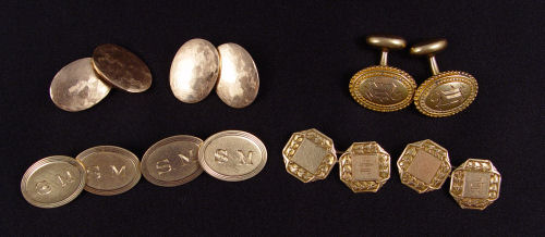 4 PAIRS VINTAGE GOLD CUFF LINKS: 3 pairs are 14k, monogrammed, 22.4g. 1 pair of hammered 10K, no monogram, 15.4g