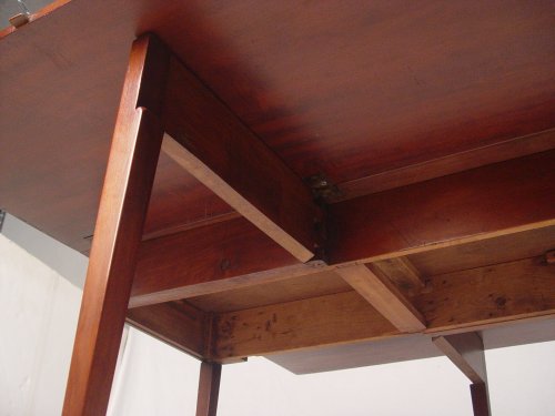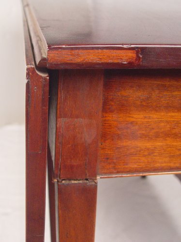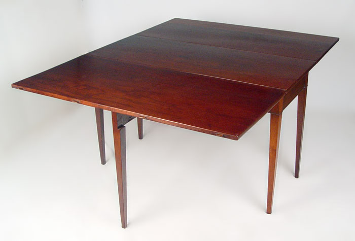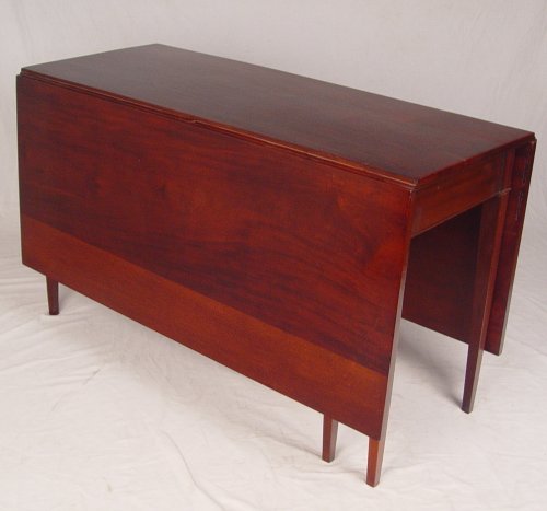 19TH C MAHOGANY DROP LEAF DINING TABLE: Ca. 1820-30'S. Center section from a D end banquette set. Swing legs. Measures 28 5/8'' high x 47 1/4'' long x 30 1/4'' wide leaves down. Leaf measures 21 1/4''.