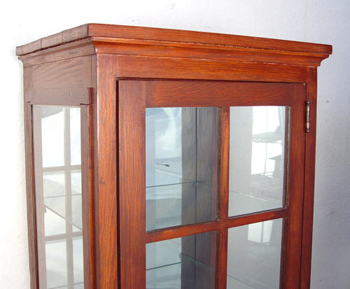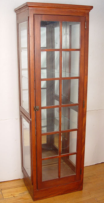AMERICAN COUNTRY PINE DISPLAY CABINET: Glass side and front storage and display cabinet. Full length single door with individually glazed panes. 3 glass shelves to interior. Overhanging molding. 74''h. x 23'' x 18''.