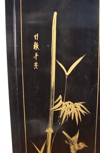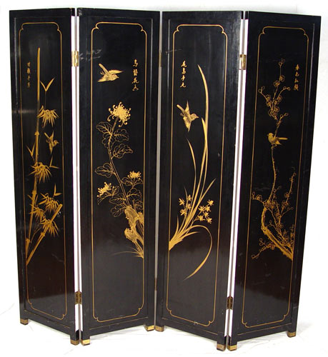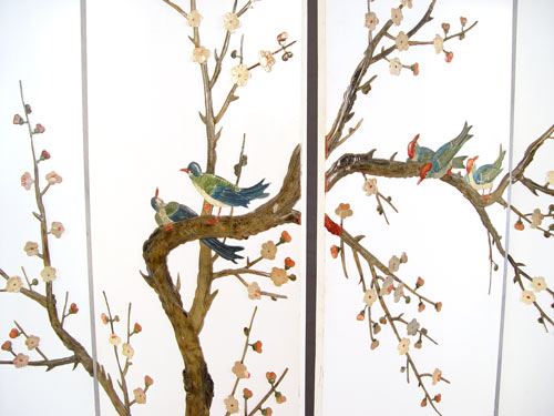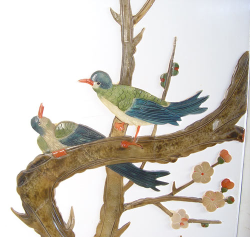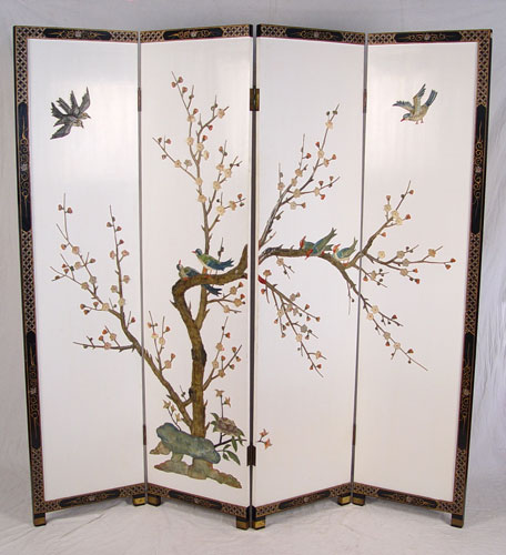CHINESE 4 PANEL SCREEN WITH CARVED STONE: Birds on blossoming branches. White lacquer ground, black verso. 6' h, each panel is 17 3/4''.