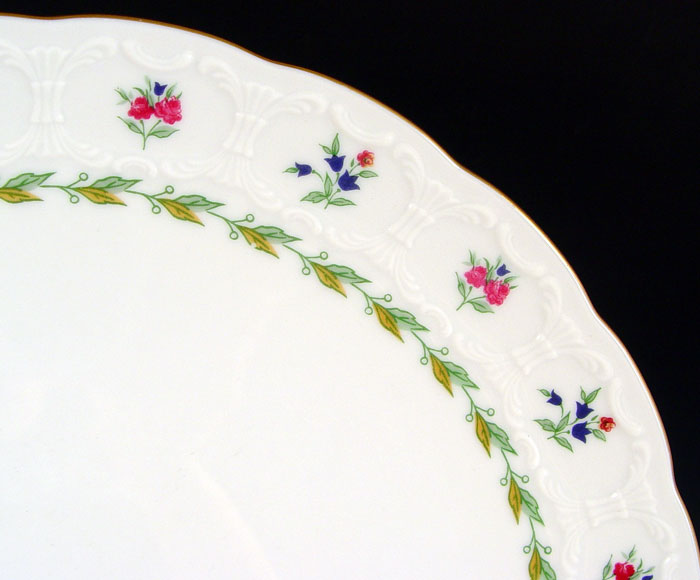 FRANCONIA CHINA SERVICE FOR 12 IN THE MUSETTE PATTERN: 63 pieces to include 12 each of dinner plates, salad plates, bread plates, cups, and saucers. Serving pieces are oval vegetable, round vegetable, and cream pitcher.