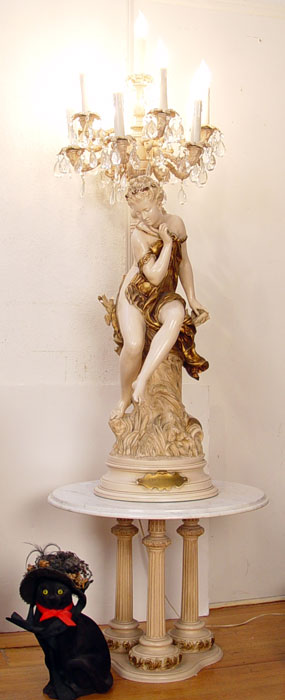 OUTRAGEOUS FIGURAL LAMP ON MARBLE TOP TABLE: 11 light candelabra semi nude statuary lamp. Metal and gesso, with crystal prisms. Rest on the white marble top stand. Lamp is 55'' tall, table is 19''. 74'' tall overall. Table is 24'' dia.