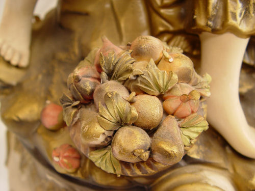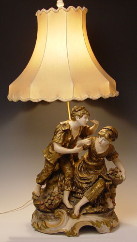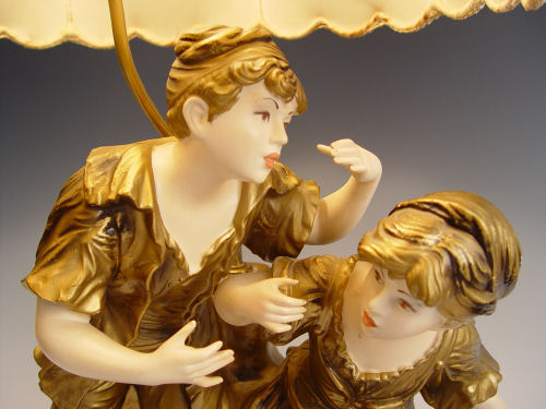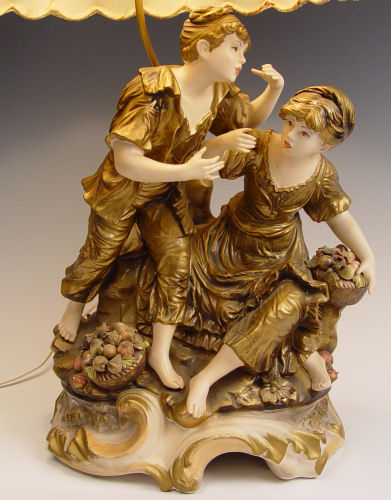 DECORATIVE GESSO AND PAINTED STATUARY LAMP: Figure of 2 children with fruit. Original shade. 40''h. 16'' wide the base.
