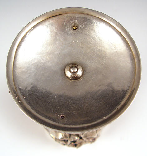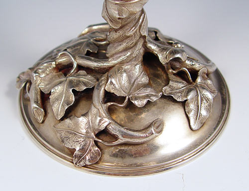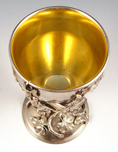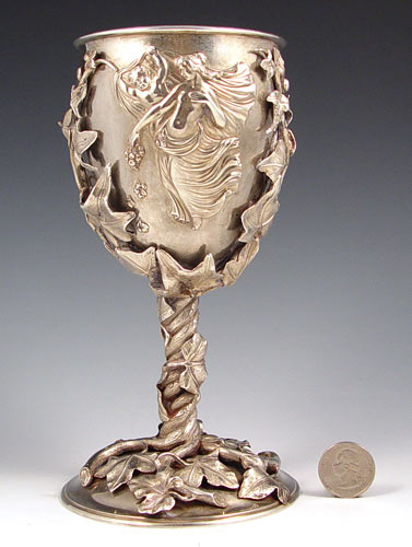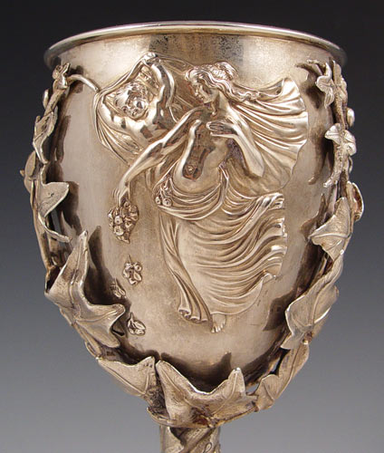ORNATE SILVERPLATE CHALICE: Allegorical cupid and Venus cup, the cup and stem entwined in leaves, gold wash bowl. 7 3/4''h. x 3 1/2'' dia.