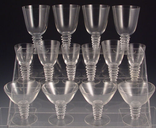 R. LALIQUE FRENCH CRYSTAL STEMWARE: 14 pieces to include 4 water goblets (5 5/8''), 4 wine glasses (4 1/2''), 2 wine glasses (5 6/8''), 4 low champagnes (4''). Only 3 with very small chips.
