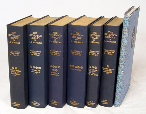 6 VOLUME STEVENSON LIBRARY EJ BEINECKE BOOKS AUTOGRAPHED: 6 volume set first editions with first volume autographed by E.J Beinecke with dedication. 2nd Volume comes with signed letter as well. The Beinecke collection of Robert Louis Stevenson items is held at Yale University. Set also comes with a overall guide of the Beinecke Rare Book and Manuscript Library.