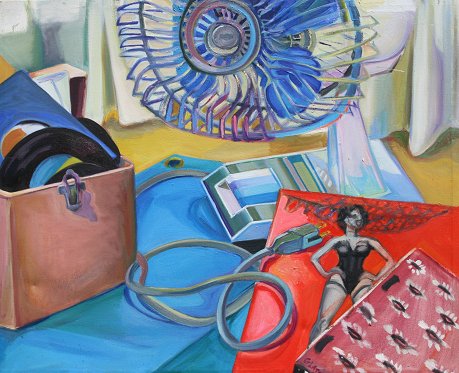 GLASSER, Rona, (American, 20th C.): Modernist Still Life with Fan & Records, Magazines, etc., OIL/C, 29'' x 36''.