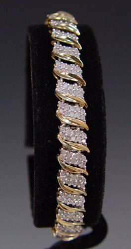 3.5 CTW DIAMOND LINE BRACELET: 10K yellow gold bracelet contains 349 round full cut diamonds. Weight: 3.50 Ct. Approx. Rated I2-I3 in clarity and I-J in color. Missing one tiny diamond by clasp. The diamonds are prong set. Locking closure with figure eight safety clasp. 7 1/4''L. Weight: 12.1 grams.