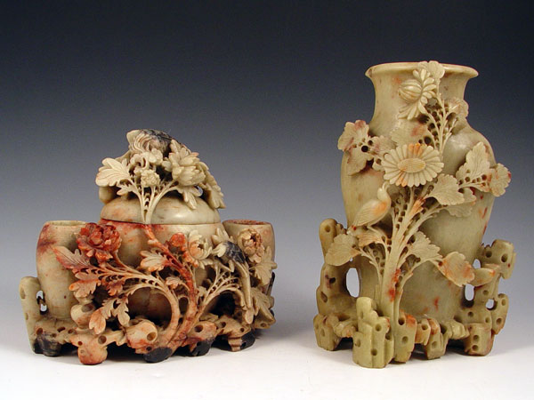 CHINESE INTRICATELY CARVED SOAPSTONE: 2 piece lot to include 1) Vase, 8'' high. 2) Carving with covered jar centered by 2 pen holders, 6''h x 8''w.