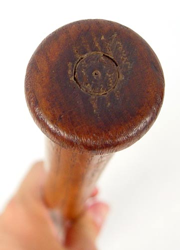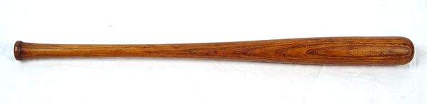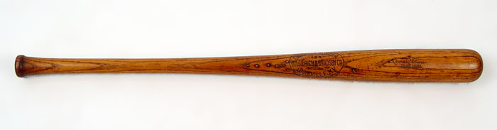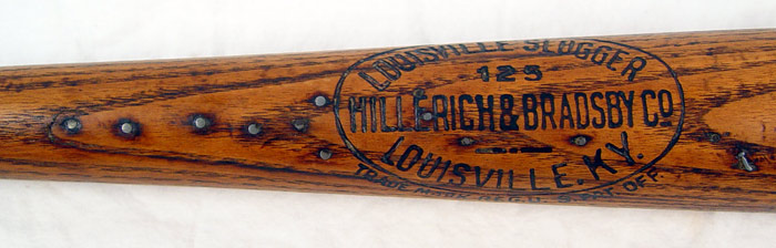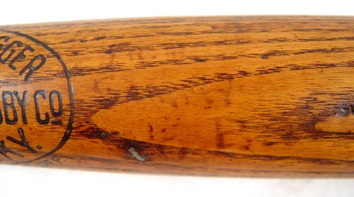 1920'S LOUISVILLE SLUGGER SIGNED GAME USED BAT: Lewis Fonseca model. Note early repair with old nails. Illegible light signed players name ''Garrity''?. Dark age color. Measures 34 3/4'' long, approx 36 oz. with nails.