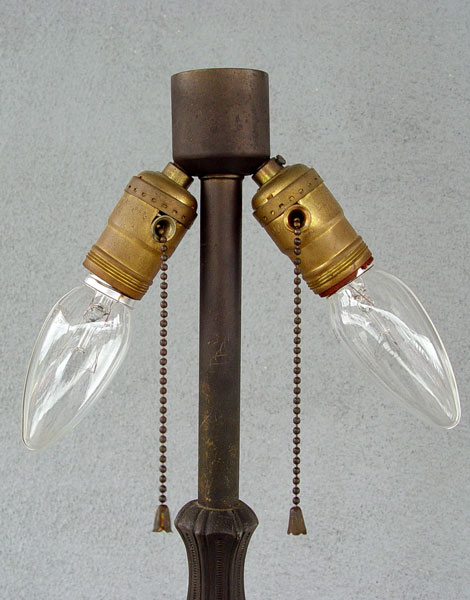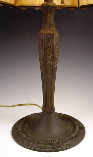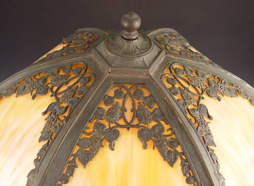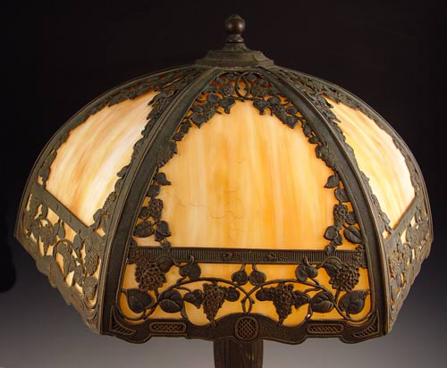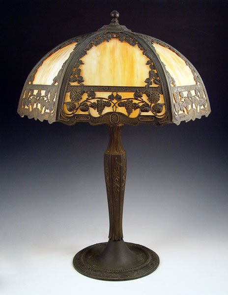 VINTAGE SLAG GLASS TABLE LAMP: 6 panel caramel slag glass domed shade with grape vine metal filigree design. 2 socket, pull chains. Measures 22'' high overall x 8'' base dia. Shade measures 7 1/2'' high x 14 1/4'' dia.