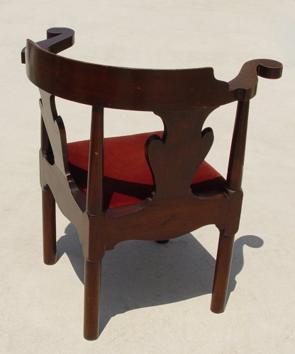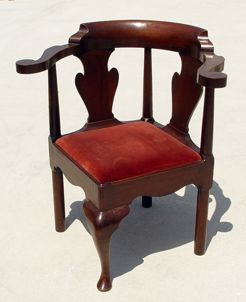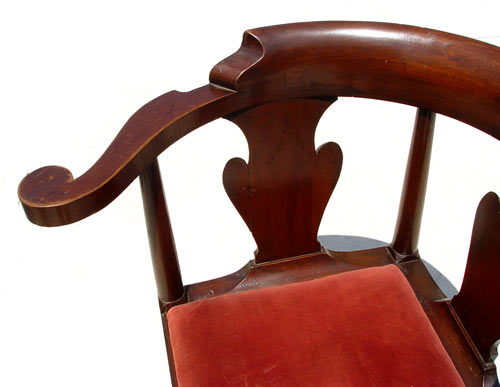 19TH C MASSACHUSETTS MAHOGANY CORNER CHAIR: Urn shaped splats. The cylindrical back legs and arm supports turned from one piece of wood. Measures 34 3/4'' high x 30 3/4'' wide x 29 1/2'' deep. Seat height is 19'' from floor.