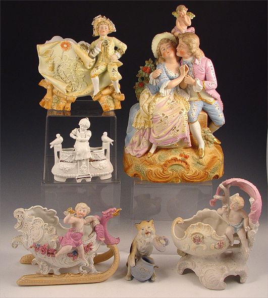 6 PIECE GROUP OF VICTORIAN GERMAN BISQUE FIGURES: 6 mantle top figures and vases, the smallest being the cat, 4 1/4'', the largest courting couple with cupid, 13'' tall. Please note repair to cupid.