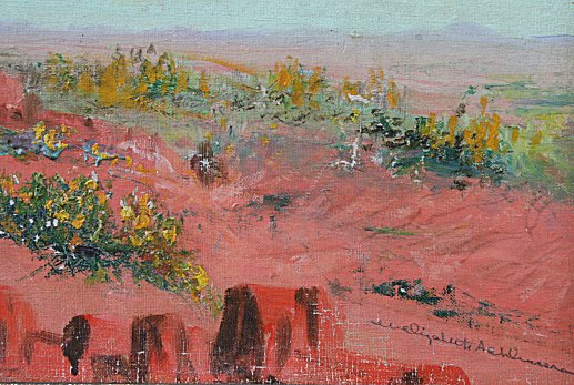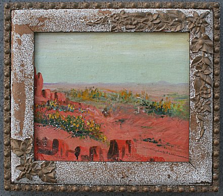 SCHLEUSSNER, Elizabeth, (American, 20th C.): Desert Scene, OIL/CB, 10 1/8'' x 12 1/8'', signed, framed, 15'' x 18''. Paint flake, needs inpaint.