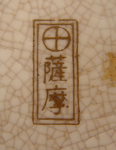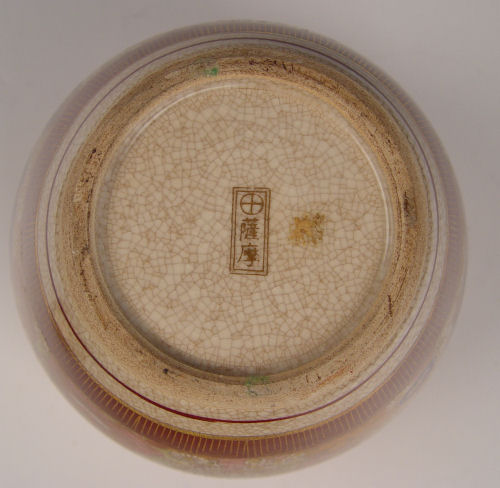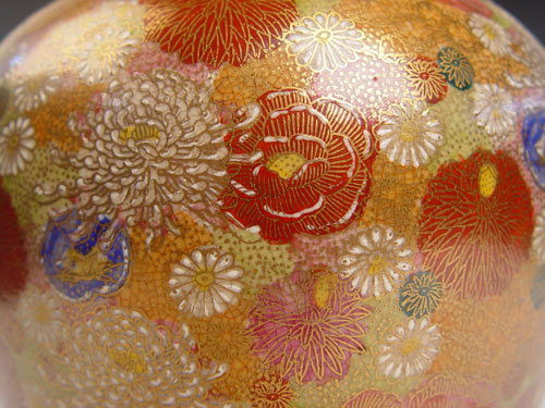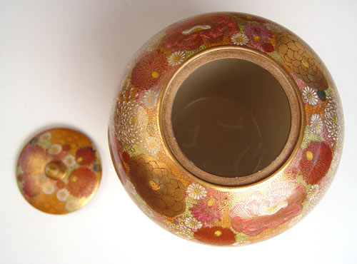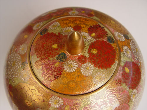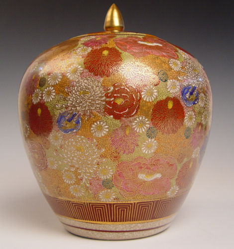 KUTANI SATSUMA COVERED JAR: Meiji period. Decorated with all over floral blossoms, raised white enameling and gold. 9 1/2'' tall. Gold cross mark with characters, possibly Hodata.