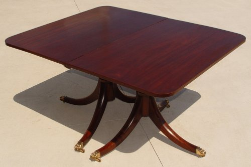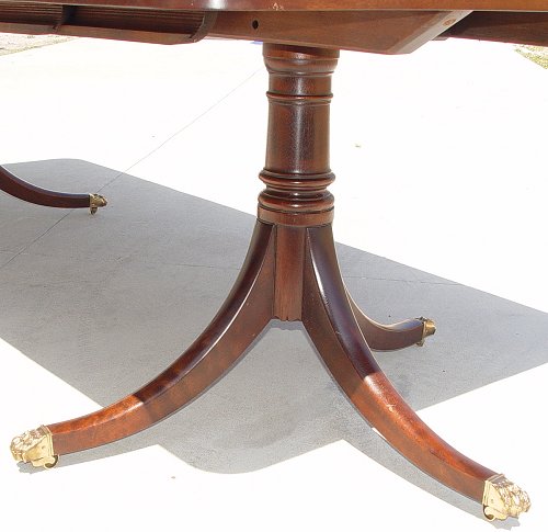 MID 19TH C MAHOGANY DOUBLE PEDESTAL DINING TABLE: Solid mahogany table, splay legs capped with brass. 28 3/8'' high x 52'' x 43 3/4''. Comes with 2 leaves 22'' wide each.