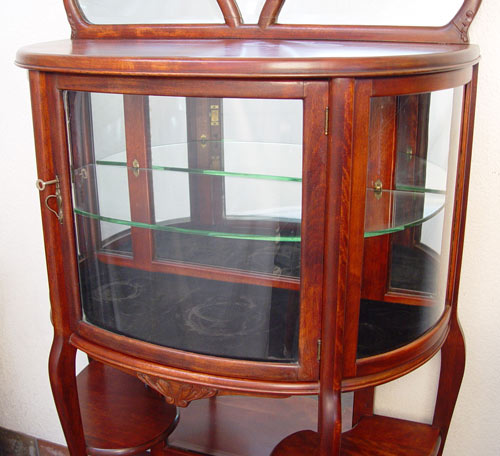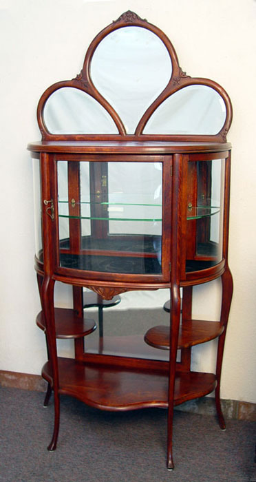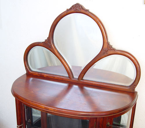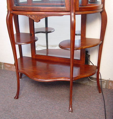 EDWARDIAN MAHOGANY ETAGERE: Trio of mirrors fan over a glass bow front curio. Mirror back interior with glass shelf. Lower tier of open shelves with mirror back. Refinished condition. Measures 69 1/2'' high x 34 1/4'' wide x 16'' deep