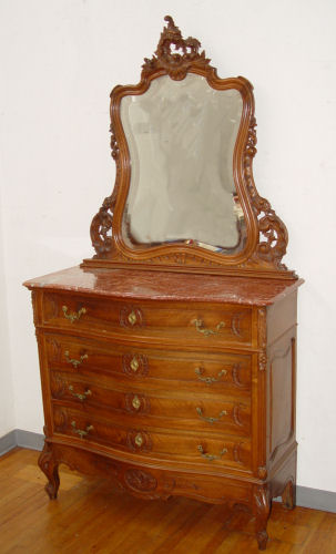 FRENCH MARBLE TOP CHEST WITH MIRROR: Ornate scroll carved beveled mirror over a chest of 4 serpentine front drawers. Pink marble top follows the curves of the chest. Taller than usual chest measures 44'' high x 47'' wide x 20'' deep. Carved mirror measures 45 3/4'' high x 43'' wide. Overall 89 3/4'' high.