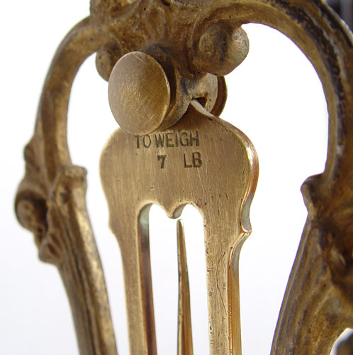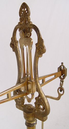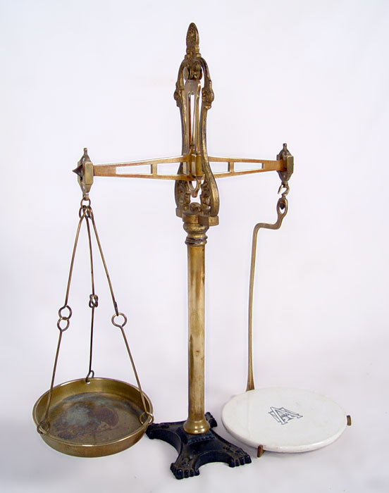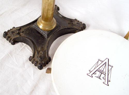 ENGLISH AVERY SHOP BALANCE SCALE: Brass center column with cast iron base and brass painted cast iron top. Single arm marked W & T Avery Birmingham, Class E. Brass tray and porcelain tray. No weights. 31'' high x 17 1/2'' wide.