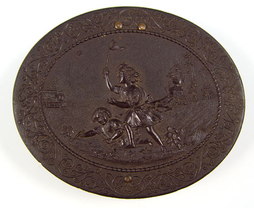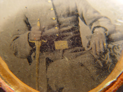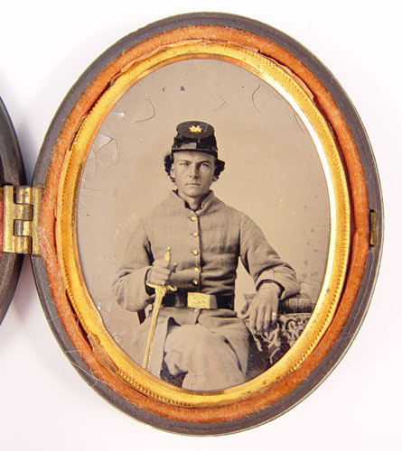 CONFEDERATE SOLDIER TINTYPE WITH SWORD: Unidentified confederate soldier seated holding a 1840 militia or possible medical officers sword. Unable to make out details on buckle or bummers cap. In oval gutta percha case with scene of girls in field. Please note image is beginning to flake. Measures 2 1/2'' x 2 1/8''.