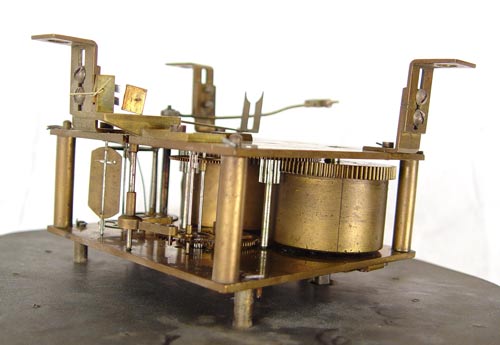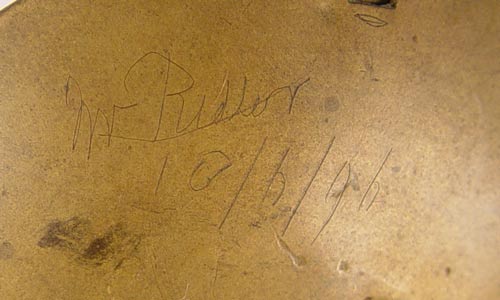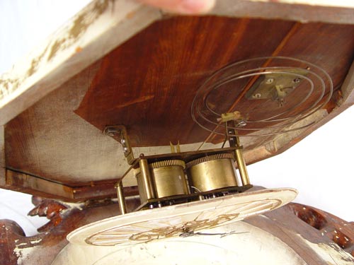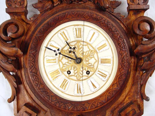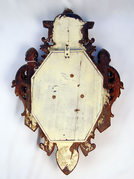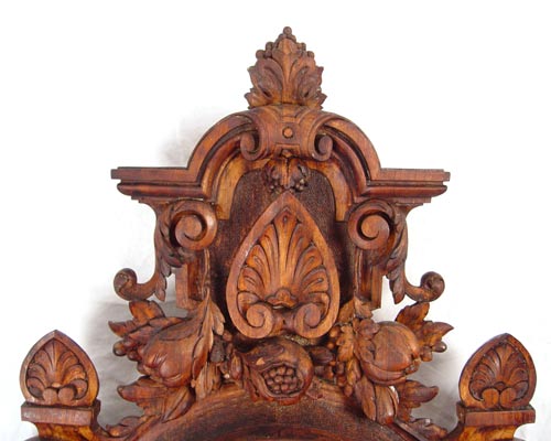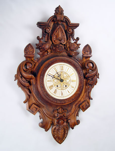 GERMAN BLACK FOREST CARVED WOOD WALL CLOCK: Circa late 19th century, case carved with swirl, fruits, nuts and architectural motifs. Porcelain Roman numerals on 9 1/2'' dial, note crack on face. Unmarked key and pendulum works with gong strike. Pendulum hand marked M. Ridler? 10/6/96. Measures 38'' high x 24'' wide. Note replaced mounting screws for works, split on back board.