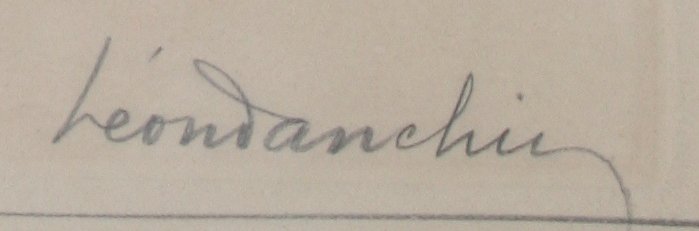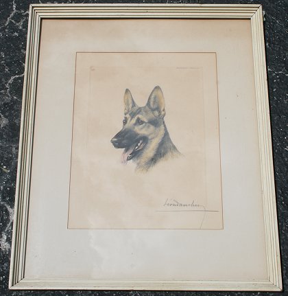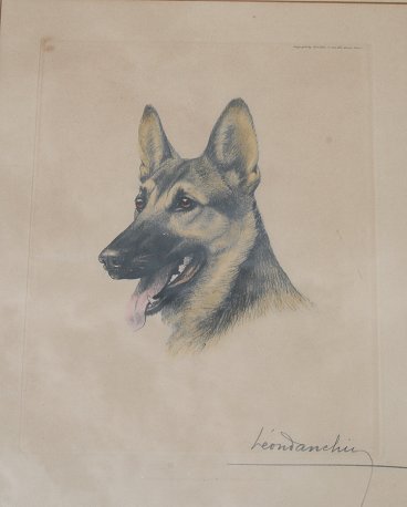 DANCHIN, Leon, (French, 1887-1939): Portrait of a German Shepherd, Etching and Aquatint, sight size 14'' x 11 1/2'', pencil signed, Danchin copyright in upper right corner, encased in white frame and matted, 23'' x 19''. Condition - Overall toning, some staining in upper left corner and several spots of foxing. Est. $200/400**