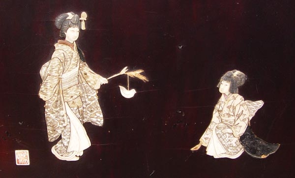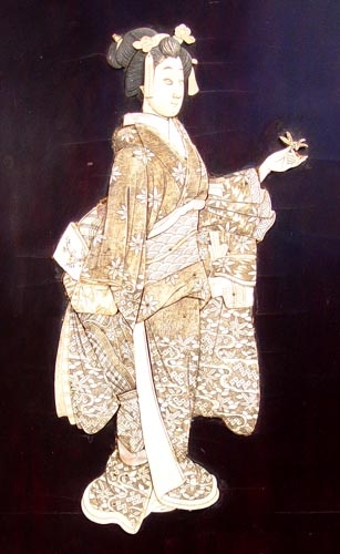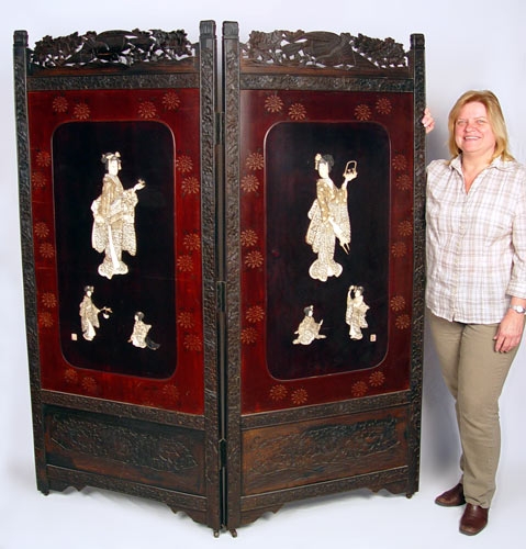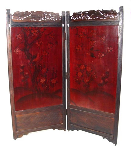 ANTIQUE JAPANESE LACQUERED ROSEWOOD AND IVORY TWO FOLD SCREEN: With pierced surmounts, applied carved ivory, bone and mother of pearl. 6' tall, each panel is 32 1/4'' wide. Est. $800/1200**
