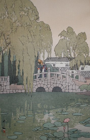 2 HIROSHI YOSHIDA JAPANESE WOODBLOCK PRINTS: ''Bamboo Wood'', & Figures On A Stone Bridge with Pond and Lily Pads, 14 1/2'' x 9 1/2'' sight size, 21 1/2'' x 19'' with frame, tiled and signed in margin under mat, unclear whether it is a stamp or pencil signature. Glued to mat, trimmed margins.