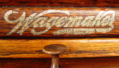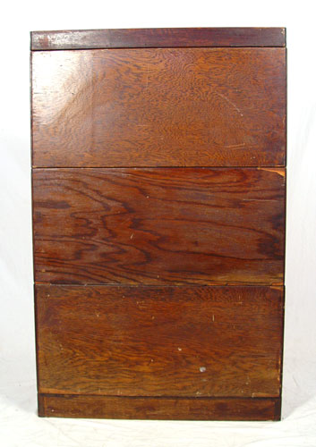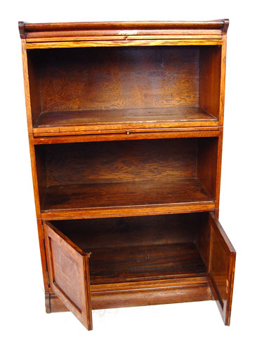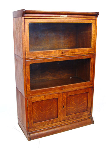 OAK WAGEMAKER 3 STACK OAK BOOKCASE: Wagemaker of Grand Rapids. 3 levels, 2 glass front over 2 door base. Measures 49 1/2'' high x 31 3/8'' wide x 15 1/2'' deep.