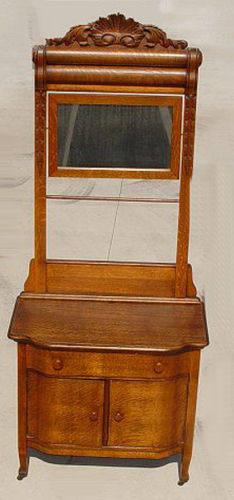 LATE VICTORIAN GOLDEN OAK WASH STAND WITH MIRROR: Tall eye level mirror over one drawer, 2 door wash stand. Measures 82'' high x 34 1/4'' wide x 17 3/4'' deep.
