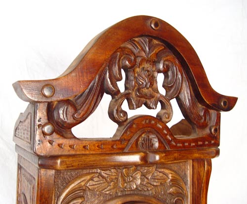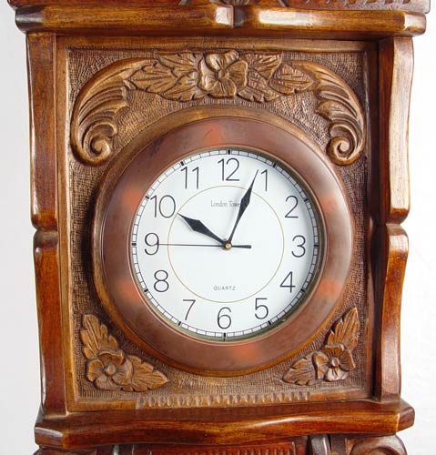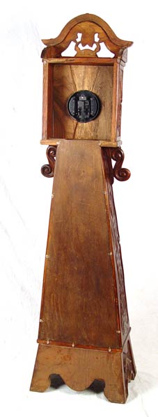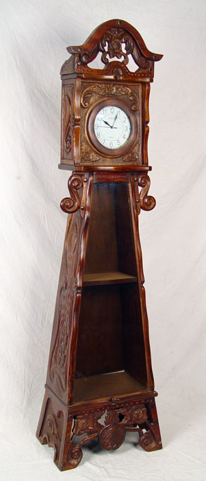 ORNATE CARVED WOOD CASE GRANDFATHER CLOCK: Carved wood case with scroll and floral design. Bottom half of case has single shelf and glass front. Works converted to quartz battery works. Marked London Tower Quartz on face. Measures 76 3/4'' high x 20 1/2'' wide x 14'' deep.