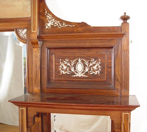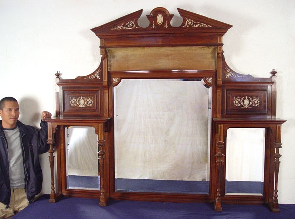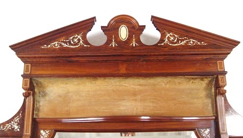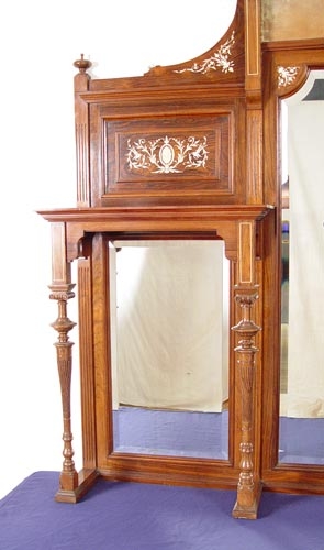 EDWARDIAN IVORY INLAID ROSEWOOD OVER MANTLE MIRROR/ BACK BAR: Trio of beveled mirrors crested by panels and crest with intricate ivory inlay. Smaller side mirrors with turned supports under shelves. Measures 64 1/2'' high x 78'' wide x 9 1/2'' deep.