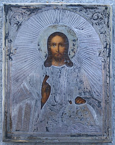 RUSSIAN ORTHODOX ICON OF CHRIST, ENCASED IN SILVER OKBLAD: Moscow mark, 1874, assayer Viktor Savinkov, 4 3/8'' X 3 1/2''. CONDITION- needs cleaning, several dents, sold as is. Est. $300/500**