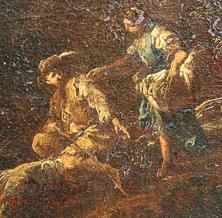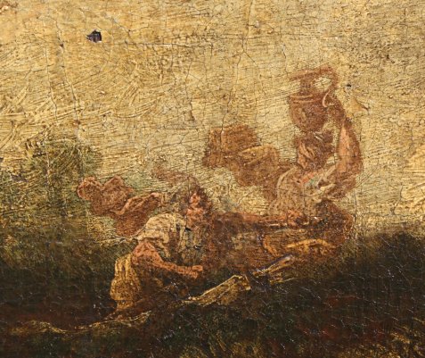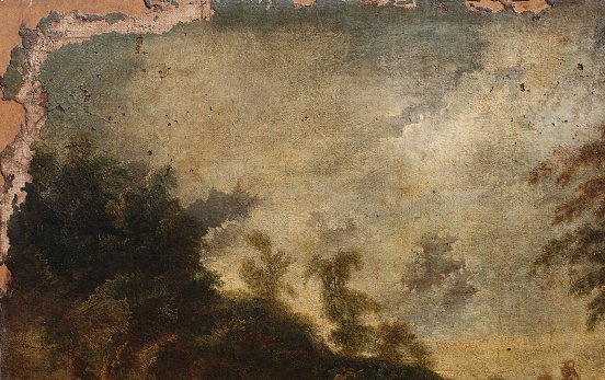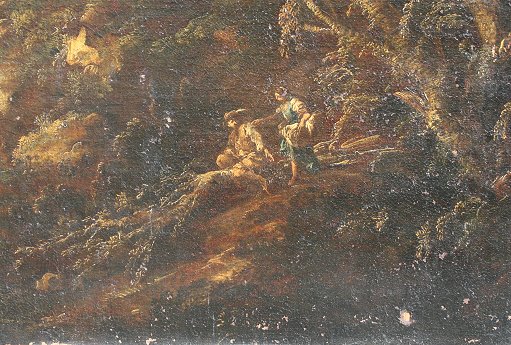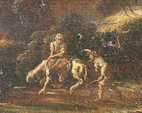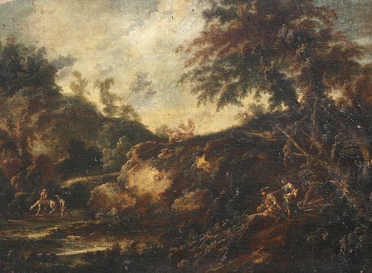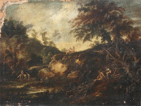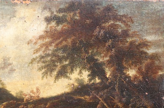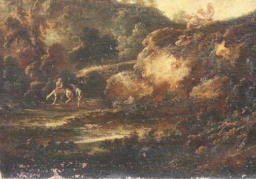 EARLY MUSEUM QUALITY OLD MASTER STYLE LANDSCAPE: OIL/Canvas laid on Board, scene depicts figures in a landscape by a stream, 35'' x 46 3/4'', no visible signature. Condition - Laid down on board, sporadic paint flecking, needs cleaning and further work. Est. $6000/8000**