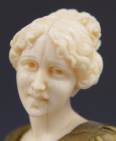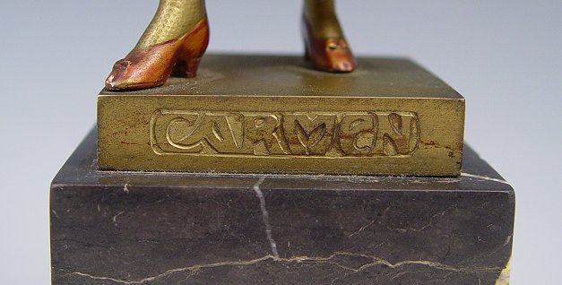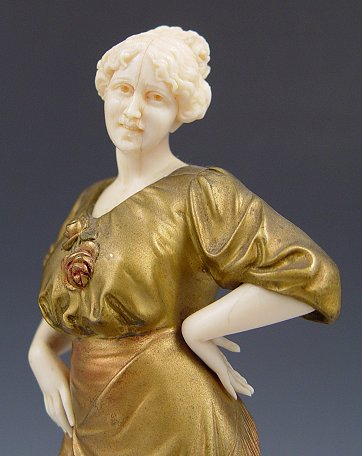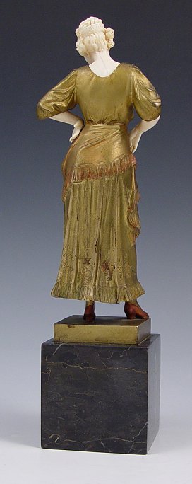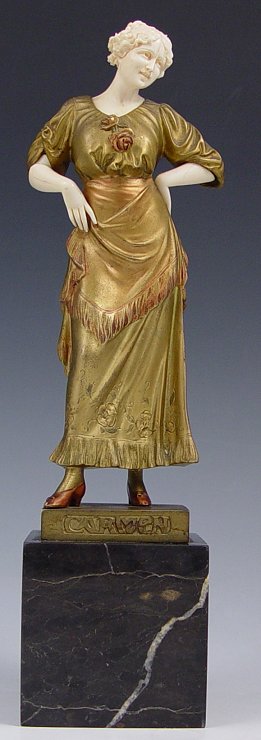 PATINATED BRONZE & IVORY STATUE OF CARMEN ATTRIBUTED TO FERDINAND PREISS: Bronze body with ivory arms, head & neck, mounted on polished stone plinth, 10 1/2'' total, 7 3/4'' bronze. Several stress cracks in ivory, and wear to patina. Est. $2000/4000**