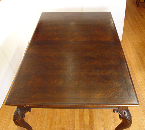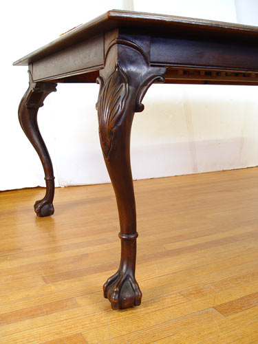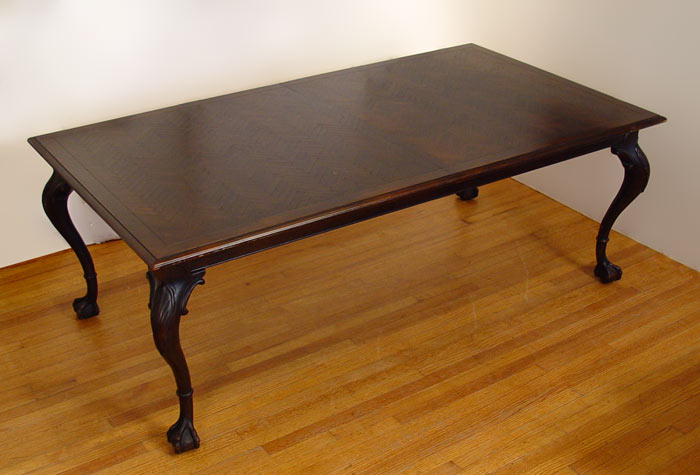 PARQUETRY AND CARVED MAHOGANY DINING TABLE: On ball & claw feet. With 2 leaves in place the table extends to 10 ft. Measures 29 1/2'' high x 81 1/2'' x 44 3/4'', 2 leaves measures 20'' wide each. Finish in need of a little TLC.