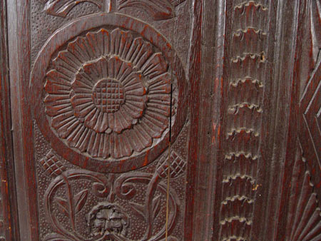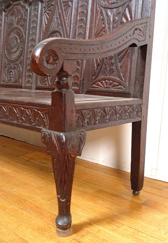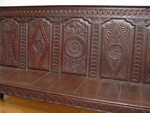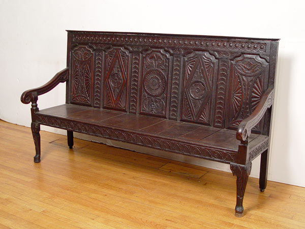 19TH C ENGLISH CARVED PANEL SETTLE: Measures 41'' high x 72 1/2'' x 23''