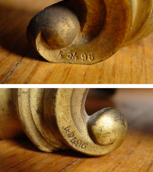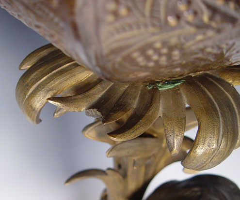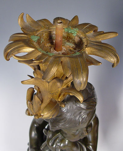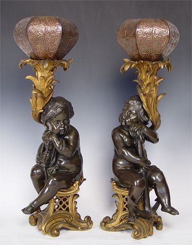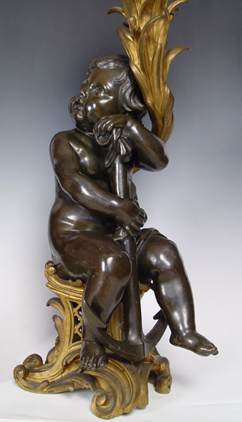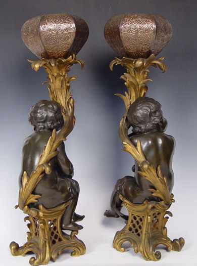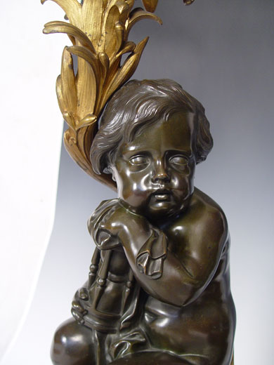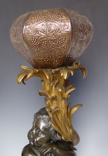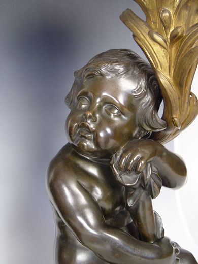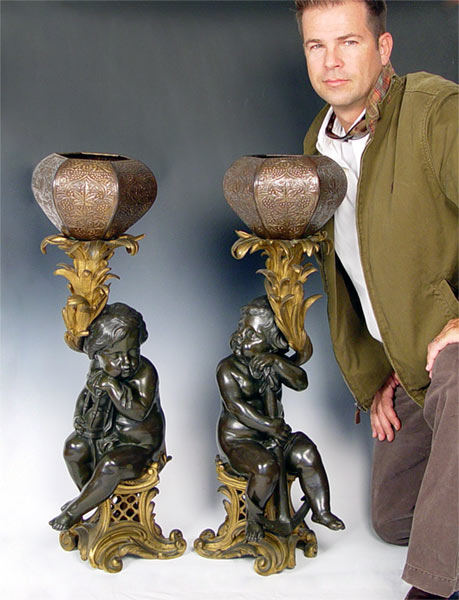 PAIR OF 19th C PATINATED FIGURAL BRONZE CHERUBS: No visible signature, impressed numerals, 34 1/2'' x 8 1/2'' x 13'', newer jardinieres. Please note leaf tip loss.