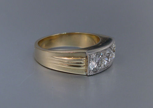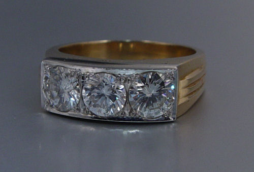 18K GENTS 3 STONE DIAMOND RING - ALMOST 3 CT: 18K yellow and white gold ring with three round brilliant cut diamonds. One is approx. .93 Ct, rated SI1 in clarity, I color. Second is approx. .95 Ct., rated SI3 in clarity, J color. The third is approx. .94 Ct., rated SI2 in clarity and K color. Total diamond weight approx. 2.82 Ct. Diamonds are bead set. Size 11. Weight 14.4 grams. Sold with current Florida Diamond Appraisers GIA graduates appraisal for $15,500. Est. $6000/9000**